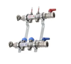1” vlak dichtend aan beide uiteinden. Elke zone heeft een 3/4”euroconus aansluiting. Tussenafstand: 50 mm. Regelkranen bevinden zich op de retourcollector (M30 x 1,5 aansluiting voor elektrothermische motor 22C). Inclusief debietmeter 0-6 l/min. Verkrijgbaar van 2 tot 12 zones.